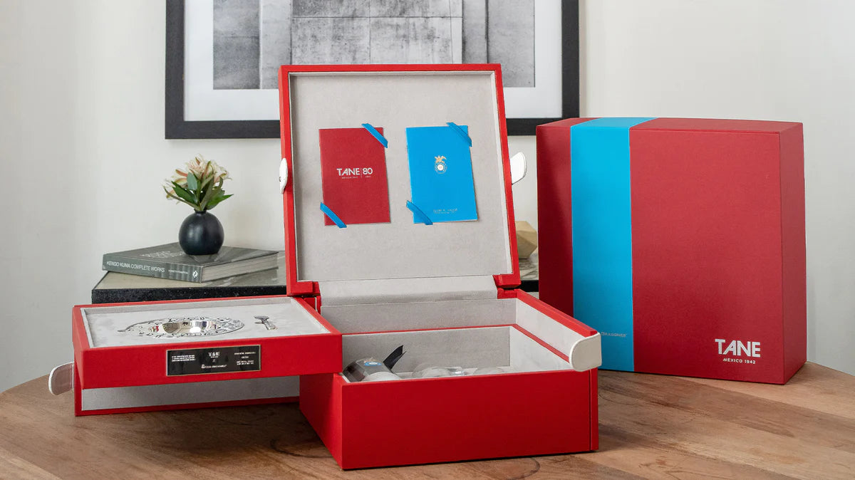 The leather exterior of the box takes its color from the iconic TANE red, in contrast with the blue interior details, as a symbol of the traditional alliance between the two houses.