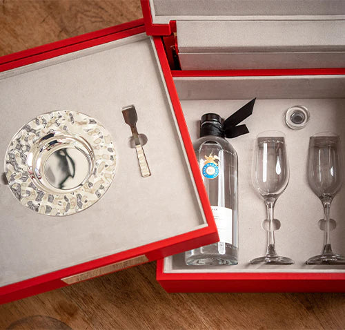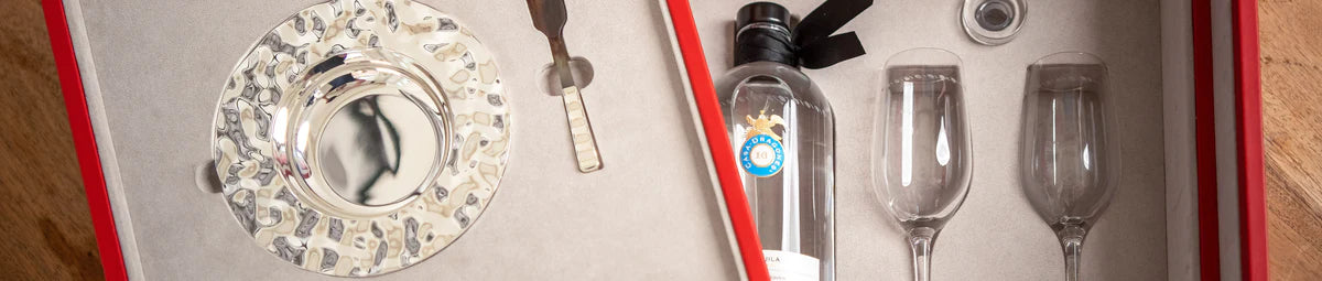 Inside it contains a sterling silver caviar cooler, a spoon hand carved in cow horn with a sterling silver handle, a bottle of Casa Dragones Tequila Joven 750 ml, two Riedel tequila tasting glasses and a commemorative silver plaque that can be personalized with the owner's name.