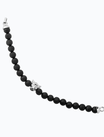 At the center of the bracelet of round natural black agate stones, is attached a jaguar head with raised spots, detailed engraved on the surface.